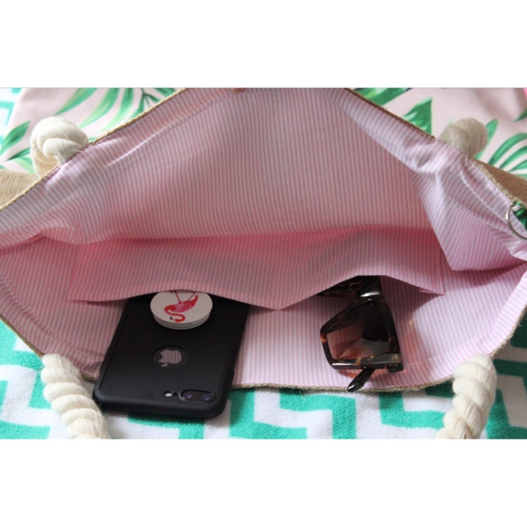 Jute beach bag with monstera pattern; it fascinates with the peace of green.