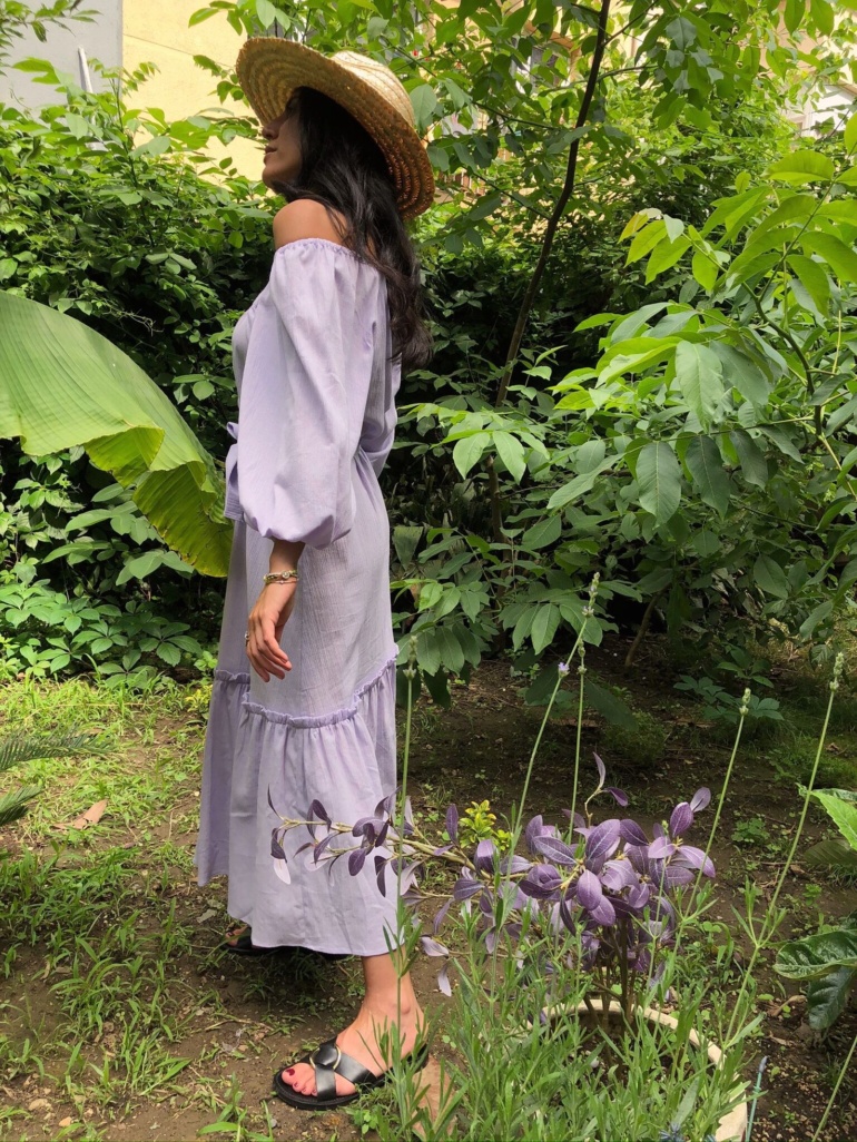 The Alice lilac gauze maxi dress, which has a flamboyant square neckline and is made of ultra-soft crinkle cotton fabric, is from long brunch meetings you have with your friends; it will take you to evening meetings. It has 3/4 long sleeves and you can use the waistband by tying it at the front or back to complete your silhouette.